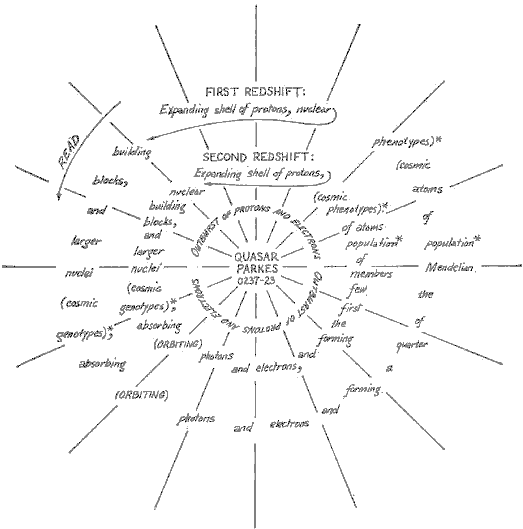 Out of the quasar expand its hollow spherical shells. In the first shell some atomic particles (protons and electrons) combine to form the simplest, smallest atoms; representatives of the second natural kingdom, namely atoms of hydrogen and helium, with a single electron shell. As the first quasar shell expands, some of the small atoms build up into larger atoms, with two and three nuclear and , electron-shells, while a small new quasar shell emerges inside the first. And as the large first quasar shell grows still larger, still larger atoms form, with four nuclear and electron-shells. Iron atoms have been observed in this quasar shell, indicating the existence of about a quarter of the population of chemical elements.8 The atoms, however, consist of particles, and particles move into, out of, and among these atoms. At this period of its development, this quasar shell thus constitutes an ecosystem made up of two natural kingdoms: a lower kingdom of particles and a higher kingdom of atoms, always and necessarily integrated.