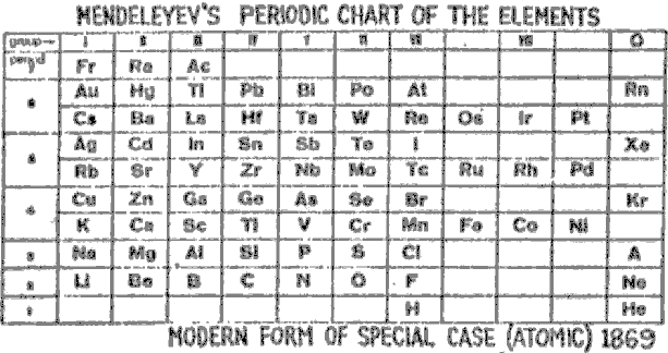 The Periodic Chart of the Chemical Elements appears on the walls of chemistry labs and class rooms around the world; and it appears in several forms. Whatever its form, it has developed from a brilliant arrangement of data about the chemical elements which early l9th century chemists and physicists had accumulated. This classification was announced in 1869 by the Russian chemist Dimitri Ivanovich Mendeleev.20 Its structure has been verified, extended and improved ever since, and currently displays the form given it by Glenn T. Seaborg, Chairman-emeritus of the U.S. Atomic Energy Commission.21 For purposes of exposition, however, I have simplified its representation i~to s form elosex' to the one originally proposed by Mendeleev.22