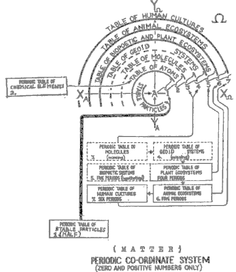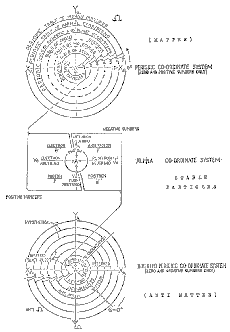 These three frames of reference-the Periodic, the Alpha, and the Inverted Periodic coordinate systems-comprise a single, logically consistent system whose components scientists can handle individually. Mathematicians can, however, visualize them as a single hyper-spatial coordinate system.35 In either case the coordinate system of unified science by-passes (or, rather, incorporates) the four-quadrant construct shown in the center of Figure 6, the Cartesian coordinate system.