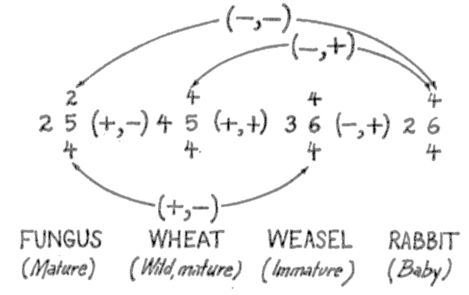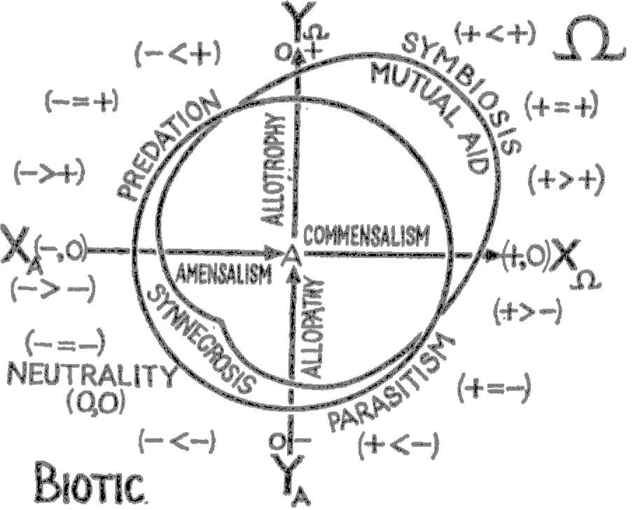 Mathematicians, of course, see instantly that the method of calculation appropriate to the Cartesian coordinate system does not suffice for the Periodic coordinate system. The methods appropriate to the latter include the former, but go beyond it.--One method, developed by Harold G. Cassidy, is set forth in the Addendum to his Chapter I. Another method, which is still incomplete, was developed by Gause and Witt, following Volterra, Lotka and others.30,31 At the suggestion of G. Evelyn Hutchinson, I generalized this construct in 1947, thereby obtaining the Periodic coordinate system. However, while their equation works in quadrants 1 and 3, Cassidy and I have not succeeded in adapting it to quadrants 2 and 4. Through their method is promising, it is therefore here omitted.--Interested mathematicians are invited to take up this calculation tool and make it useable throughout the Periodic coordinate system. It can almost certainly be done.