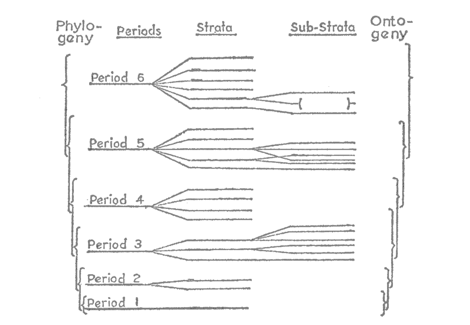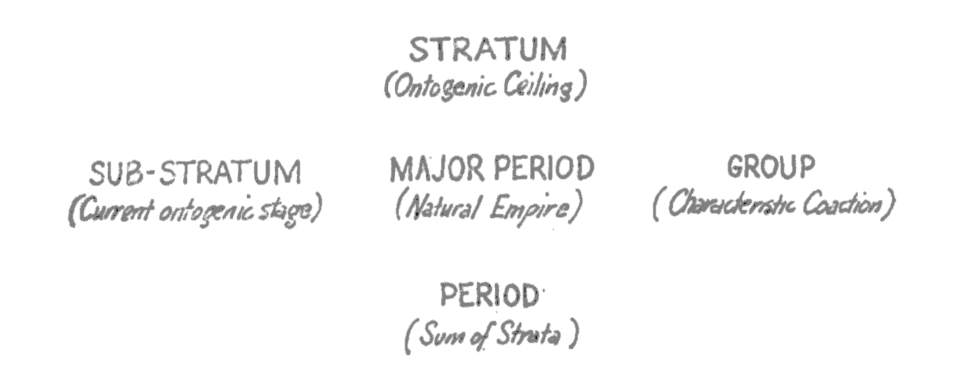 This System-hierarchic integration obliges us to recognize and coin a cumulative concept; one visually represented by the nest formed by the first two braces in our side elevation (Figure 1) and geometric ground plans (Figure 7). Namely, the concept, natural empire or Major Period. A Major Period is a cumulation of natural kingdoms or Major Strata.