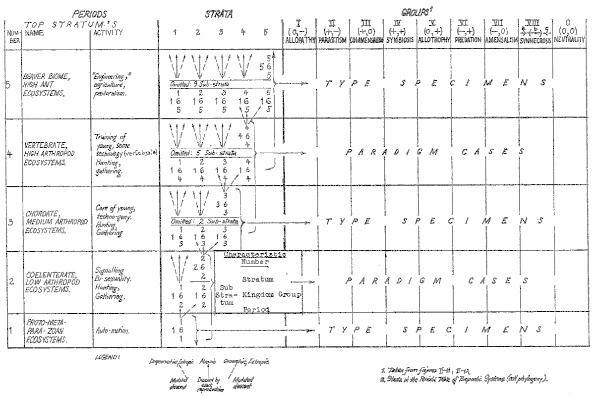 The minimal hypothesis necessary to explain the emergence of the simplest animal requires four simultaneous, coordinated changes, the kind of coincidence at which thermodynamics boggles: At some point, O. R. Anderson believes, a one-cell plant mutated part of its photosynthesizing process into rudimentary vision.l5 (It had already mutated organs of auto-motion, possibly flagelli, like those of Euglena viridis.) It sharpened a taste organ into an organ of smell, permitting it to follow waterborn gradients of decaying particles to their plant sources. At the same time one of its absorbing organs adapted itself to ingest plant ma'terial. And the development of genetic or non-genetic organs for information storage and association permitted, besides location and choice of distant foods and congenial habitat conditions, avoidance of dangers. This was the emergence of the kingdom of animals and of the highest kind of organization, which Teilhard de Chardin has called the noösphere.16 This is the sixth Major Stratum, the highest one of Major Period 6. It emerged from the lowest Period in the Periodic Table of plant ecosystems, and only the highest animal Period in the Periodic Table of animal ecosystems, that of beaver and certain ants, achieved significant control or empire over plant ecosystems.