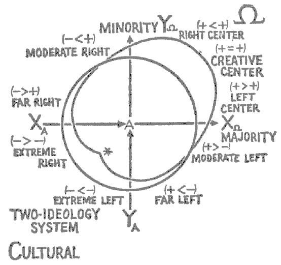 | 90. | Geometrically, this coaction falls in quadrant 3, where the coaction cardioid displays two lobes and an apex. These geometric features correspond to the three sub-Groups in chemistry's Group VIII (Figures 5 and 11 ) . The cardioid's negative apex ( - = - ) is the geometric locus of the Sub-Group whose political expression is Nihilism. (Sometimes it is misnamed Anarchism.) This coaction is so destructive that its exponents frequently destroy themselves. See Zero by Robert Payne, John Day, New York, 1950. The "political spectrum" cannot map this phenomenon because it falls next to, yet between, its limits. |