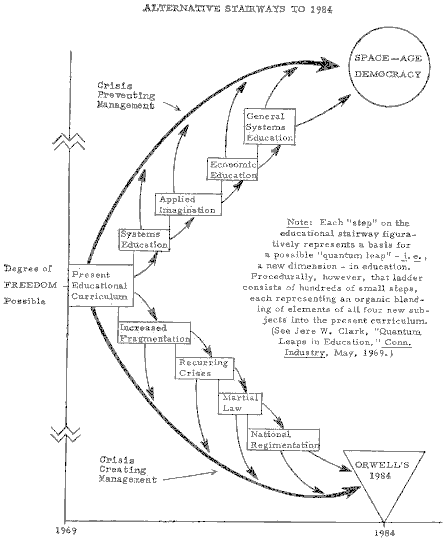 Another important capability of this mental transport medium is that it can provide a basis for crisis prevention as distinct from post-crisis administration of the process of educational change. Because of today's "explosion of explosions"--information, population, technology, interdependencies, pollution, crime, protests, and urban decay--this need is especially acute and seems to be destined to become still more critical in the immediate future. If we are to avoid letting trends toward complexity, rapidly rising expectations, and rapid change lock our society into an irreversible trend toward some highly regimented form of totalitarianism, we must somehow transcend the disciplinary barriers and create a new society. This new society would be based more on cooperation than on competition and, as is suggested in Figure 1, could make it possible to achieve ever higher and more meaningful forms of freedom.