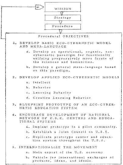 Another part of the challenge is reflected in the sketch of Figure 3 which is a proposal for designing and developing a global network of centers and institutes for the promotion of general systems methods, philosophy, attitudes, and viewpoints. The terminology used there is suggestive rather than definitive. That mission profile is the embryo of a possible blueprint for a global campaign to translate the capabilities of unified science models into a widespread program of action. The assumption is made that the entire realm or universe of knowledge would be restructured as a prerequisite to any adequate reforms in curriculum and administration.